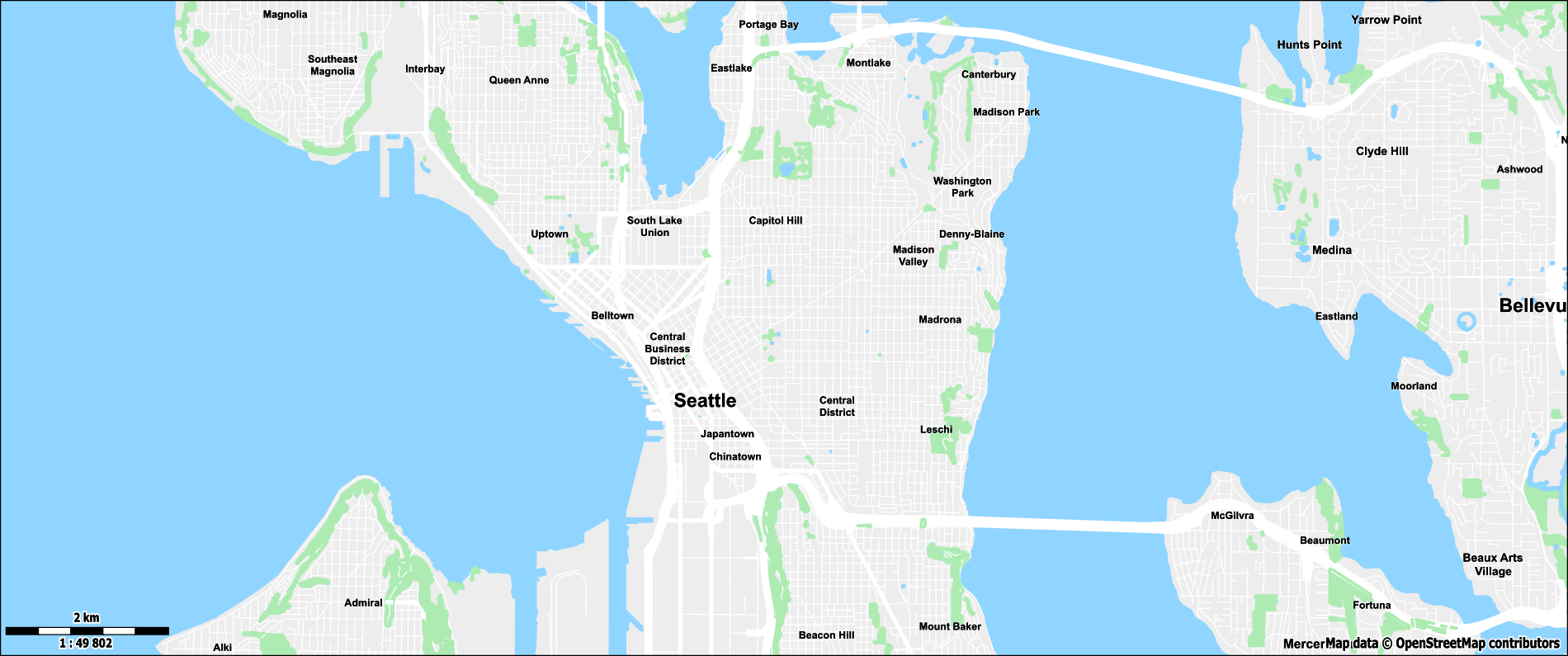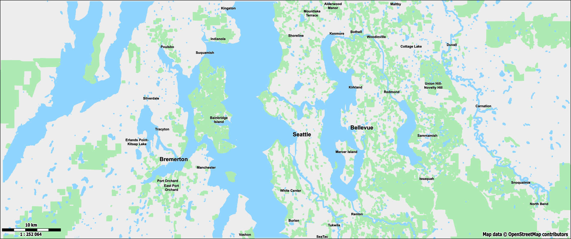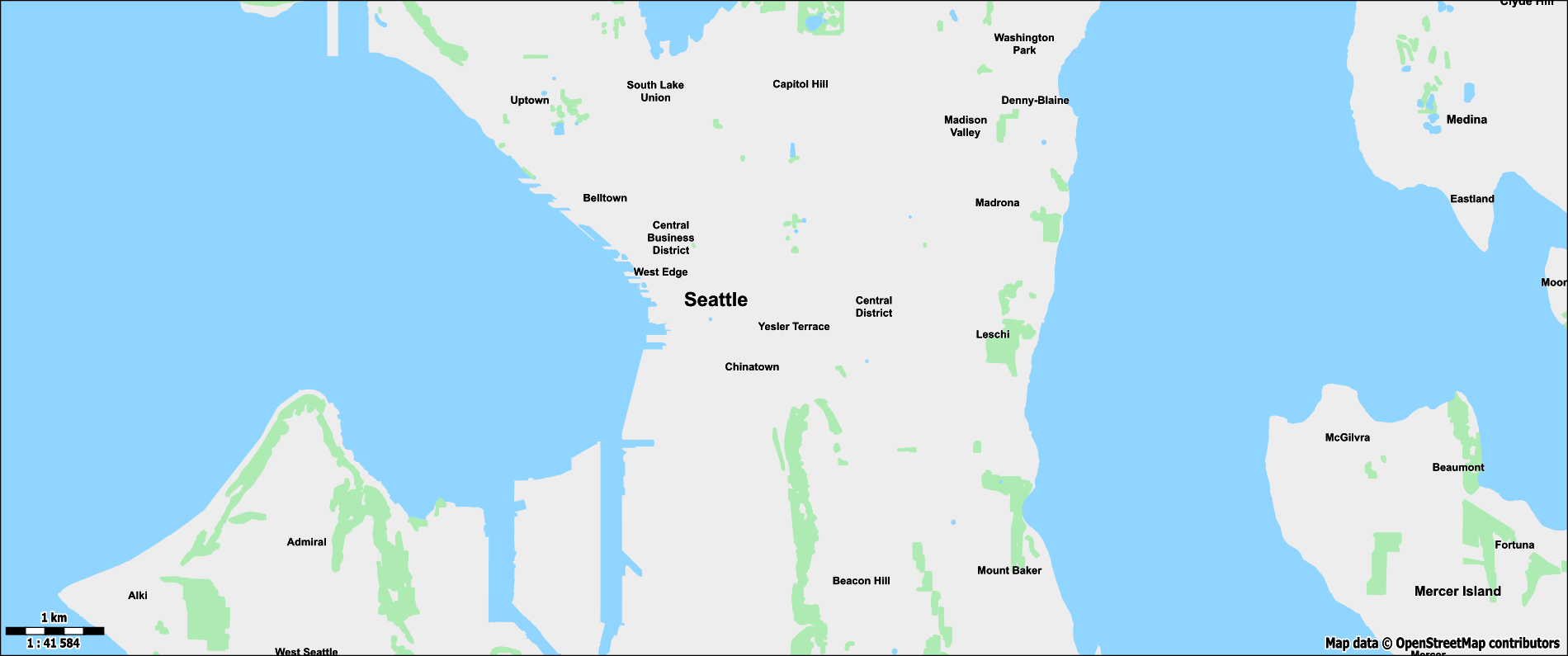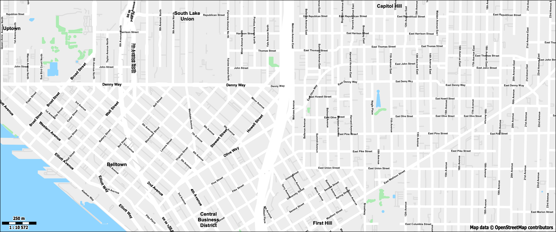 To create a custom theme, I will use Seattle, WA (US) as a reference point. I picked Seattle because it is a moderately sized city with a wide variety of transportation infrastructure like roads, highways, railways, bus routes, tram lines, a monorail system, ferry connections, multiple airports as well as bridges and tunnels. Additionally, there are major bodies of water, a river, mountain ranges, and national parks nearby.