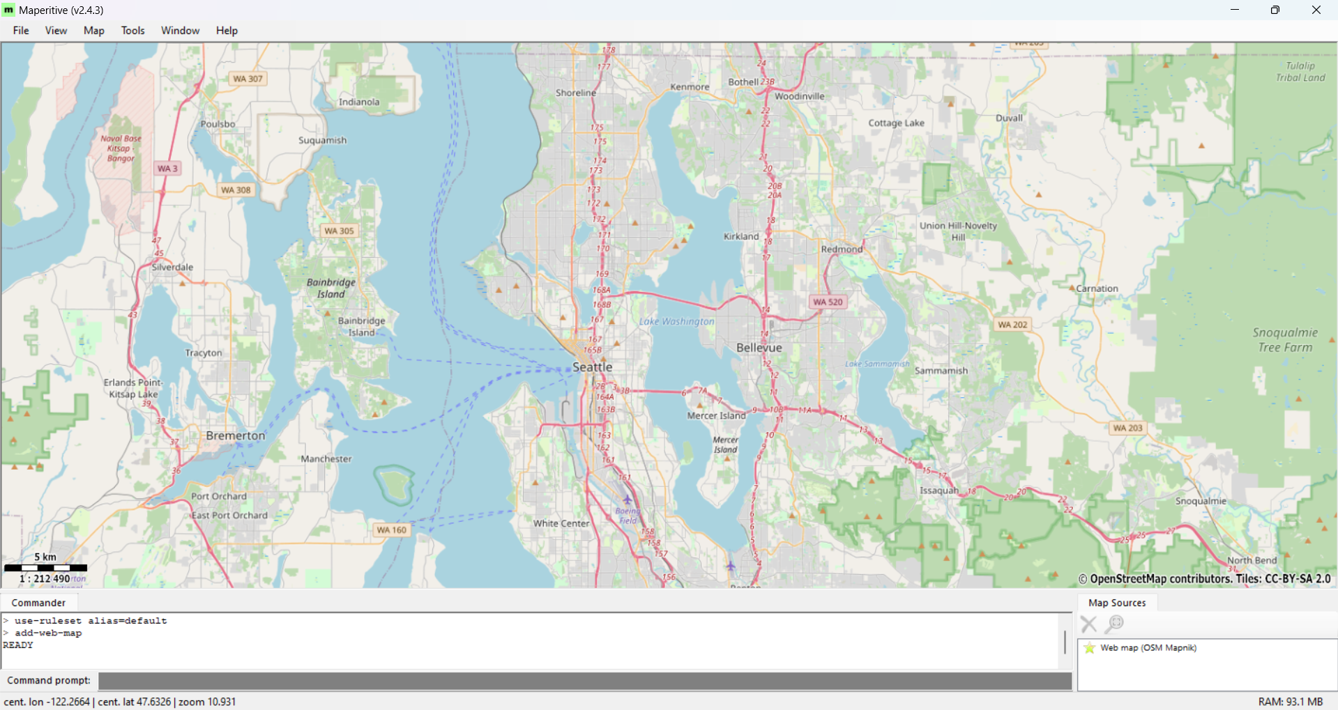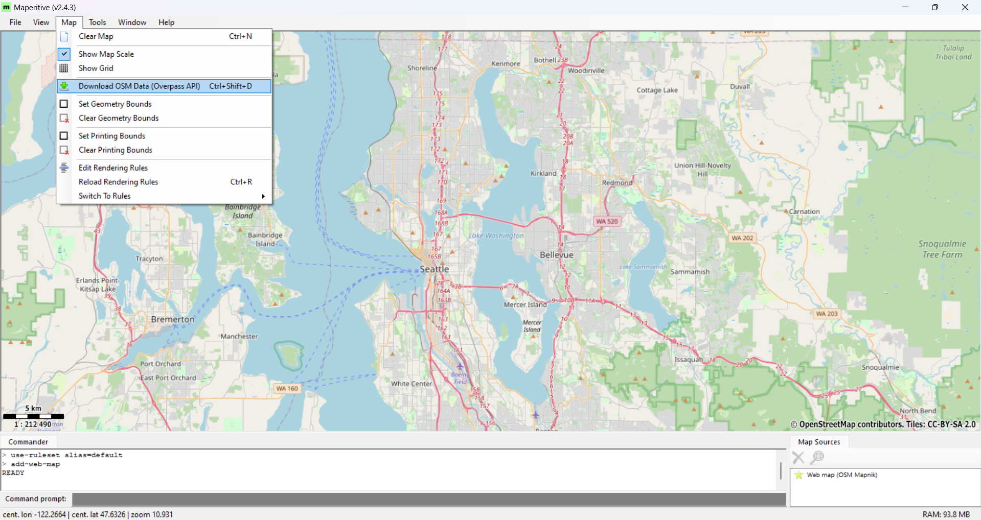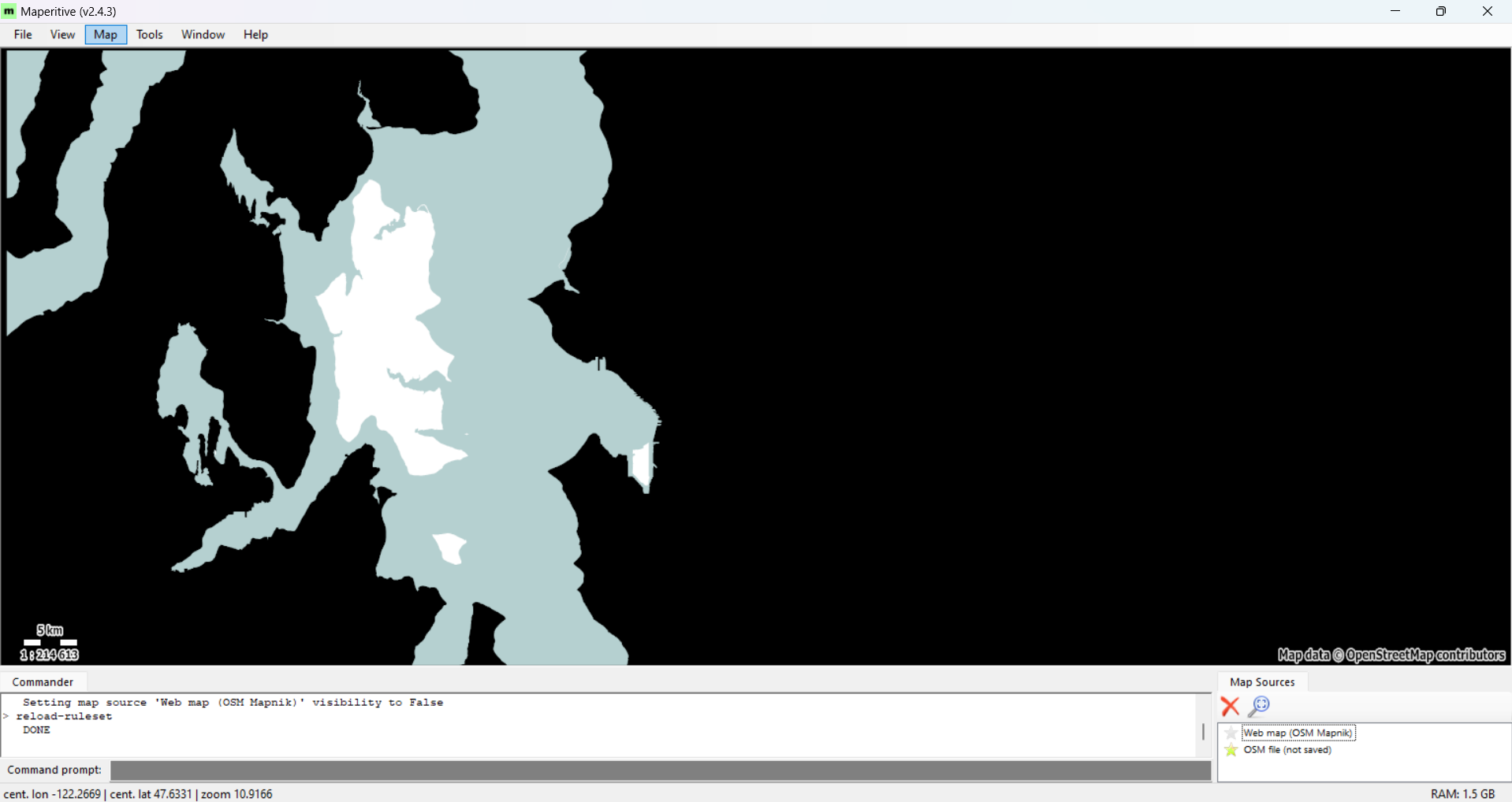 Open Maperitive and move the map view to cover a wide area of Seattle.