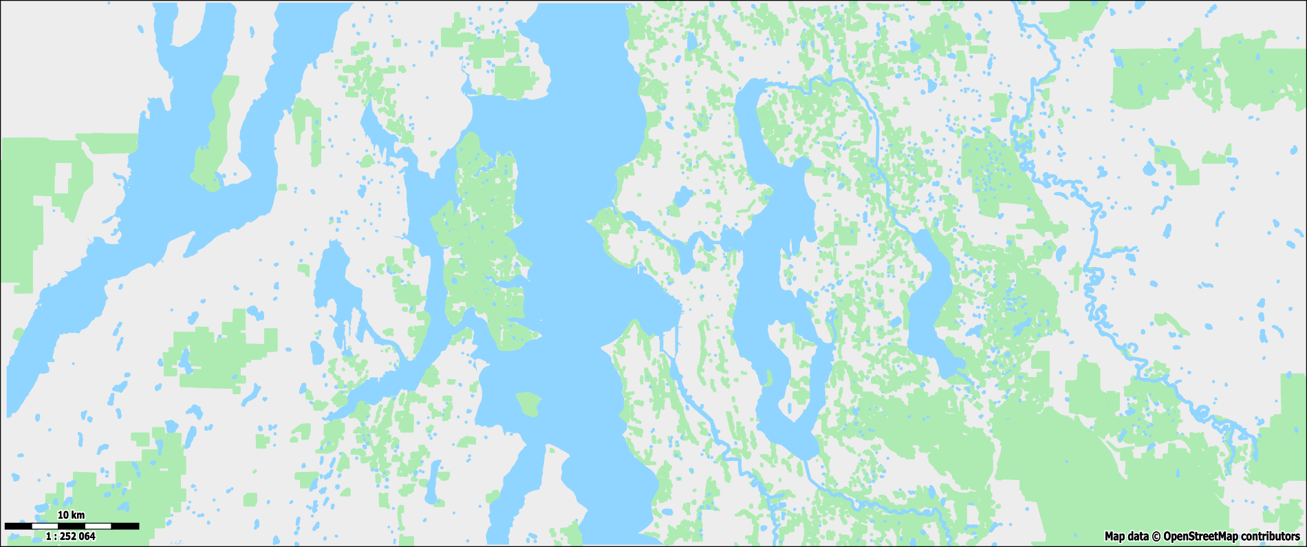 This combination of varied infrastructure and natural features withing a relatively small geographic area will make it easer to adjust and test different configuration options (e.g., adjusting scales, labels or line-widths) without having to move the map view around too much.